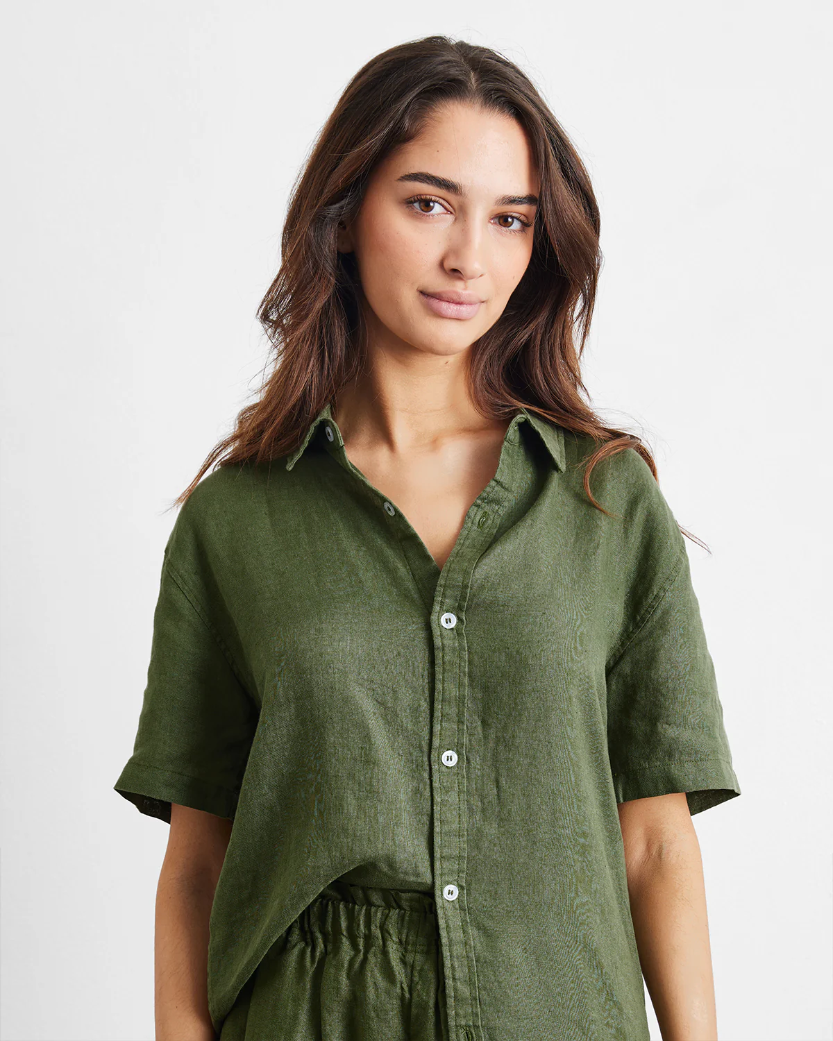 Olive 100% French Flax Linen Short Sleeve Shirt