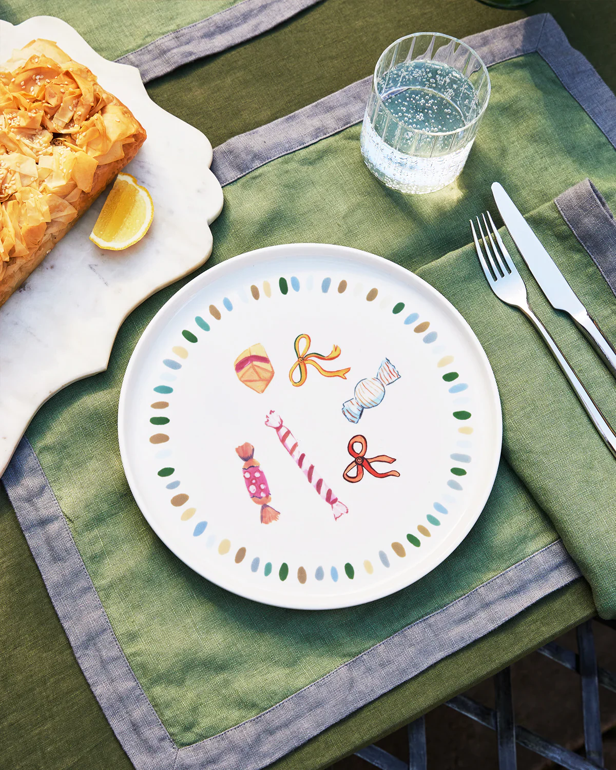 Imagine this: strolling down a Sicilian laneway you stumble across an old sweet shop, with handmade confectionary and nostalgic packaging galore. That's the spirit of Caramella, a sweetly-styled dinner plate from Idda Studio adorned with brightly-hued candy and decorative bows. It's the most beautiful base for your next afternoon tea, and pairs well with other designs from the limited edition serveware range.